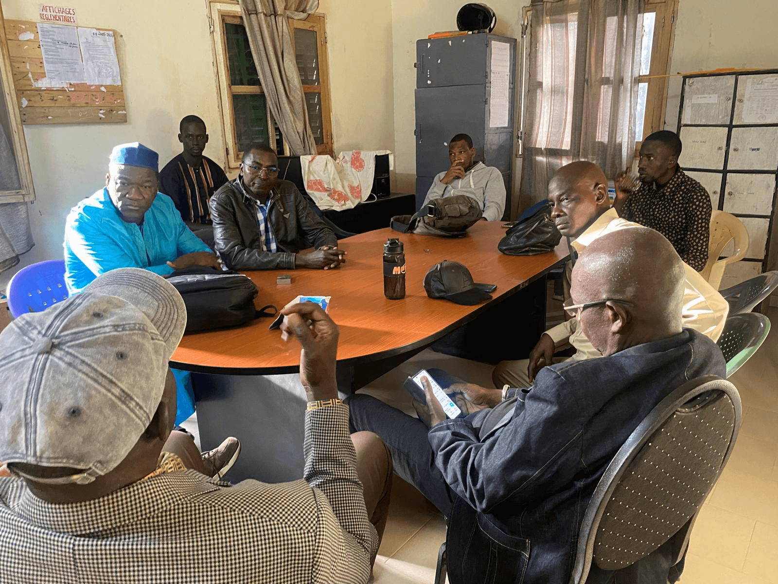 The teachers’ room where we’re meeting is a rectangular space, lit by natural light filtering through two windows with thin curtains half drawn. The walls, a faded yellow, are dotted with cork boards covered in administrative notices, printed sheets and documents pinned in place. The furniture is austere: a worn metal cupboard, shelves stacked with folders and a side blackboard filled with notes. Everything conveys a sense of permanent provisionality, but also of constant use. At the centre of the room, a large wooden table hosts an improvised meeting between the President of the Dagana Departmental Council, Ababacar Khalifa Ndao, the Secretary General of ORU Fogar, Carles Llorens, the school’s headmaster, Mr Bakhoum, and other education officials. All of them sit on mismatched plastic chairs and celebrate the launch of the two buses sent from Barcelona. Nevertheless, it is necessary to design a structured pick-up plan that can benefit children and young people living in villages within rural communities located a half-hour walk from the paved road.
